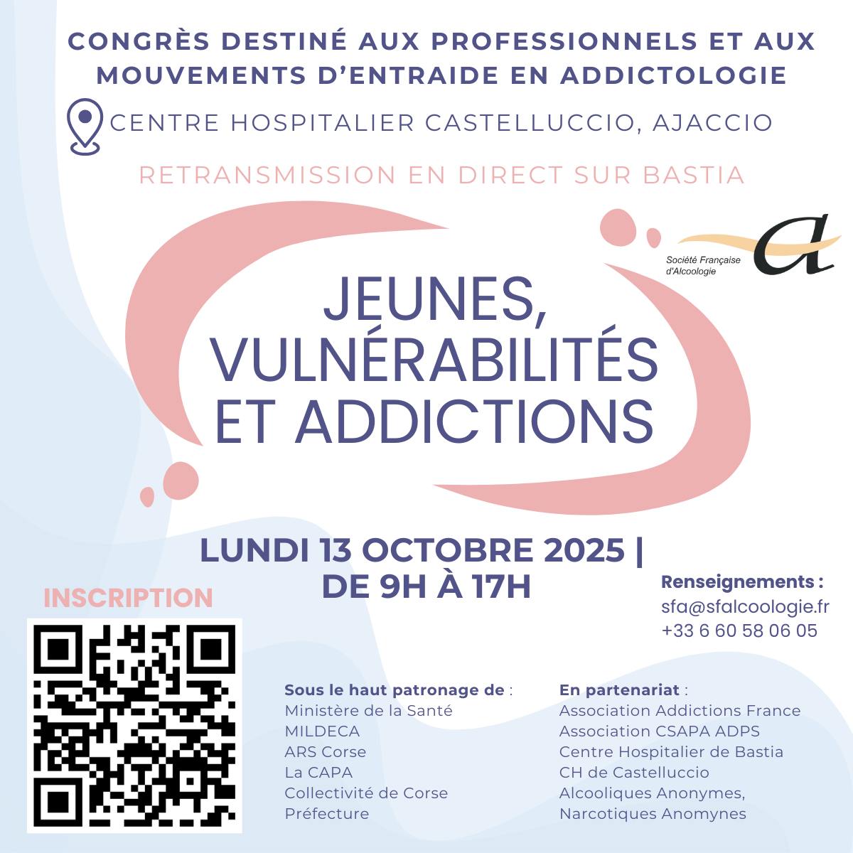 La Société Française d’Alcoologie et d’Addictologie et ses partenaires ont le plaisir de vous annoncer la première édition de la Journée régionale, qui se tiendra le Lundi 13 octobre 2025, au Centre Hospitalier de Castelluccio à Ajaccio sur le thème : Jeunes, vulnérabilités et addictions.